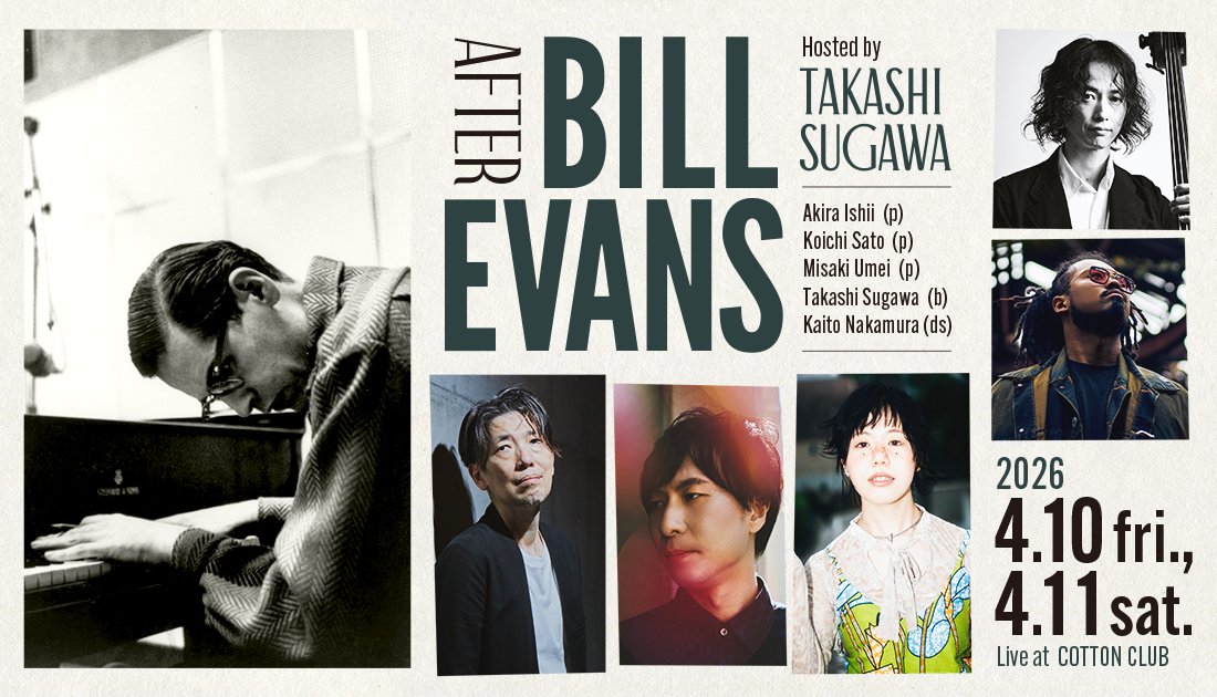 現代ジャズシーンに至るまで、ビル・エヴァンスが与え続けてきた多大な影響の現在地、それからその先へと続く未来の可能性に焦点をあてます。異なる世代から個性豊かな3人のゲスト・ピアニストを迎え、お馴染みの名曲やスタンダードはもちろん、オリジナル曲も交えながら、それぞれの視点からエヴァンスの音楽と向き合います。この貴重な2日間のステージを、どうぞお見逃しなく。