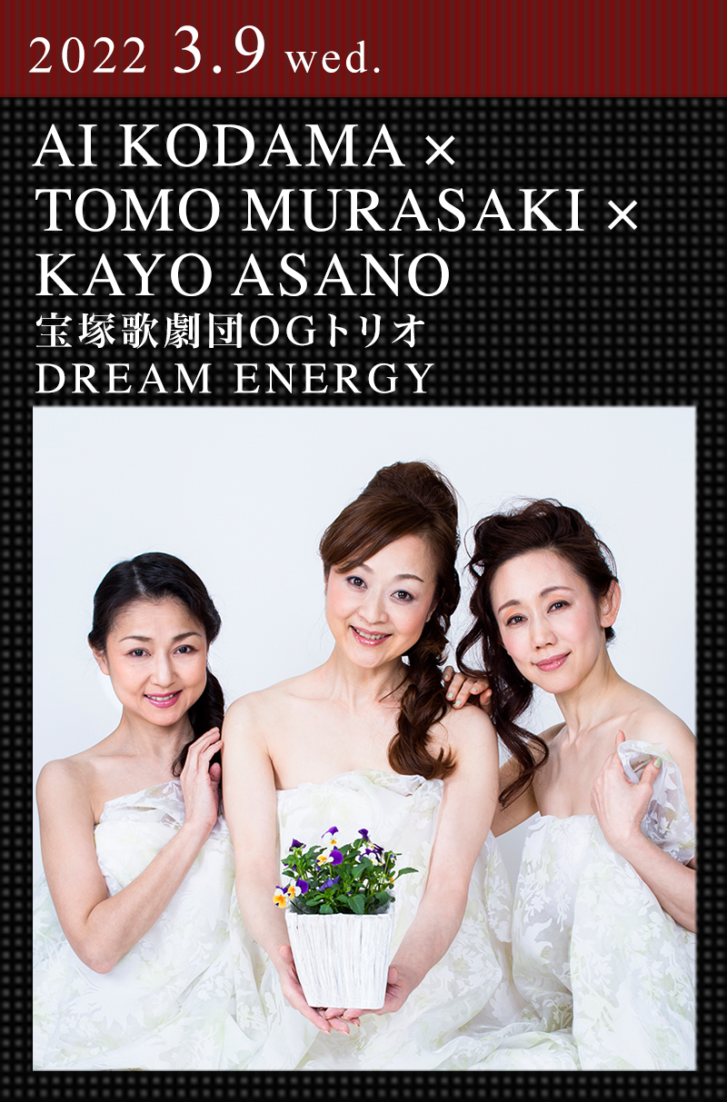 宝塚歌劇団66期生月組トップ娘役・こだま愛、70期生雪組トップ娘役・紫とも、74期生月組トップ娘役・麻乃佳世。日本のエンターテインメント界に欠かすことのできない3名の宝塚OGがコットンクラブに初めて集い、『DREAM ENERGY』と題するスペシャル・ステージを繰り広げる。当日は、軽妙なトークやダンスに加え、世界のポップス、ミュージカルのナンバーから往年の宝塚ナンバーまで幅広い楽曲を歌唱。新進気鋭のミュージックエンターテインメントユニット“金魚スピリト組”とのコラボレーションによる、しなやかで躍動的、かつ華やかなショウは、すべての観客をとことんポジティヴにするはずだ。笑顔あふれる3月の一日が待ち遠しい。