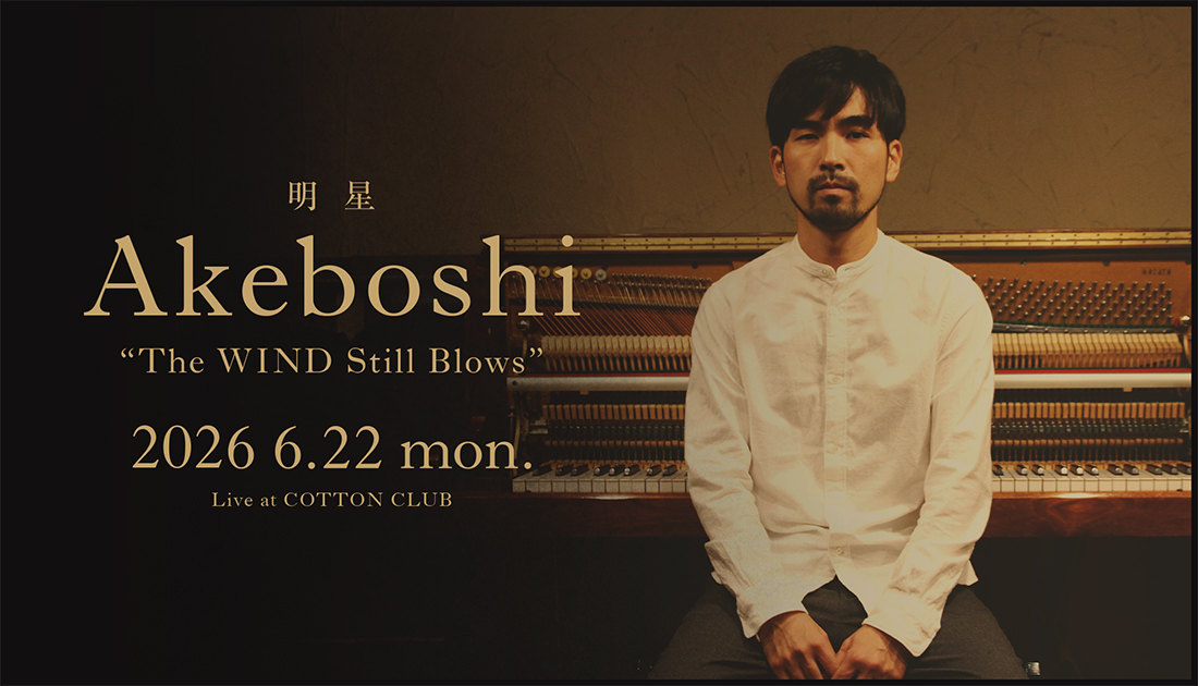 シンガーソングライターとして、また映画やCM音楽の作家としても活躍する明星/Akeboshiがコットンクラブ初登場。昨年末に公開されたTHE FIRST TAKEでの「Wind」演奏動画は400万再生を突破し、国内外で大きな話題を呼んだ。さらに今年開催された各地でのライブも完売が続出するなど、改めてその存在感を示している。そんな中決定した待望のコットンクラブ初公演では、THE FIRST TAKEでも見事な演奏を披露した酒井絵美(fiddle)、豊田耕三(Tin Whistle)、mouse on the keysの川﨑昭(ds)に加え、初期から明星/Akeboshiを支え続ける濱野泰政(b)、永田“zelly”健志(g)も参加。実力派ミュージシャンが揃う貴重なフル編成で、THE FIRST TAKE出演以降の歩みの集大成ともいえるステージを届ける。