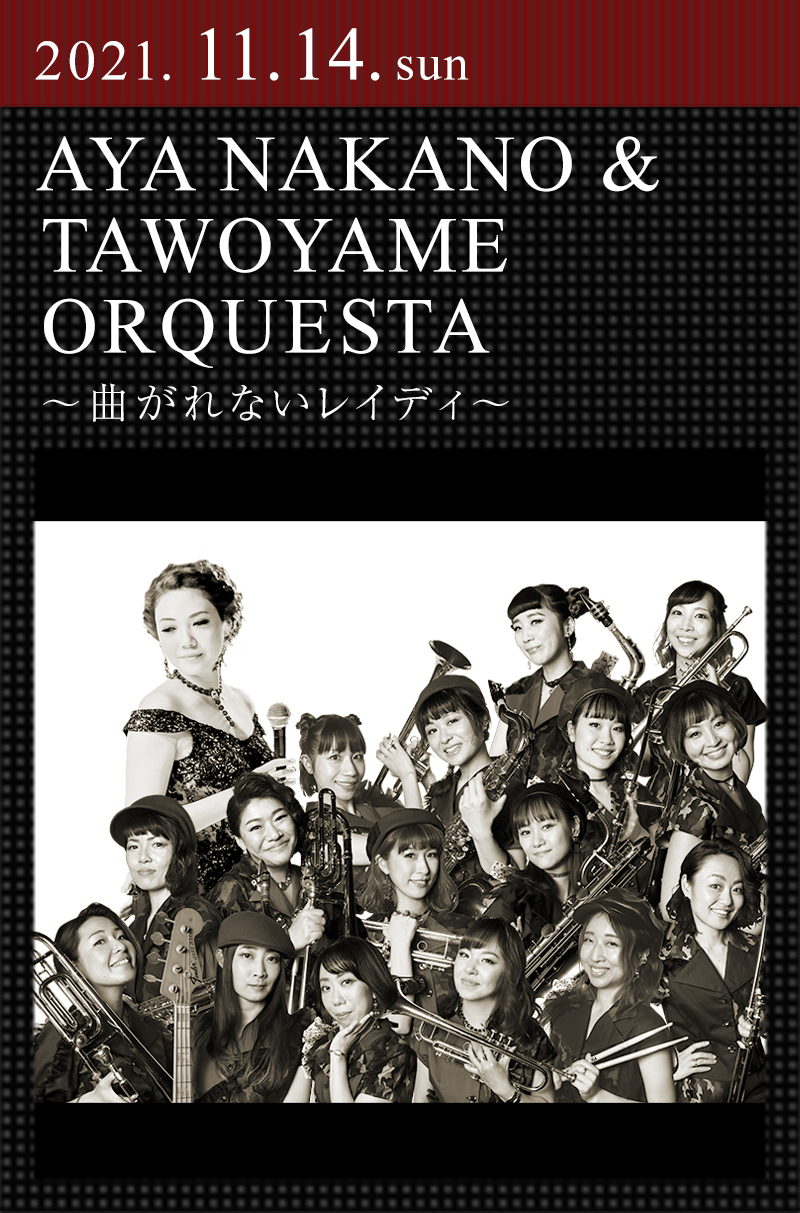 昭和歌謡をテーマに深夜のクラブや酒場を沸かしてきたシンガーなかの綾が、女性のみで構成されるトロピカル・ビッグバンド"たをやめオルケスタ"とコットンクラブのステージに登場。なかの綾は2010年に『ずるいひと』でデビューし、以後『へたなうそ』『わるいくせ』など、昭和歌謡のカヴァー曲で構成された作品を発表。またラテン・バンド"CENTRAL"とタッグを組み活動を展開している。"たをやめオルケスタ"とは2018年のアルバム『Double Game』でコラボレーションして以来、定期的にライヴを重ねている。なかの綾の妖艶な歌声と16名の華麗なレイディたちが放つ迫力のビッグバンド・サウンドが、会場を昭和の香り漂うグランドキャバレーの世界へと誘う。