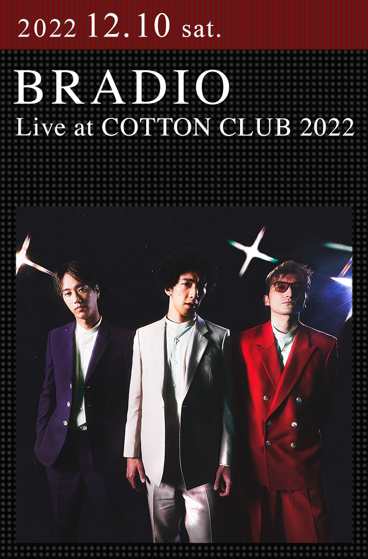 “日常に彩りを加えるエンターテインメント”をコンセプトに結成された3人組ロック・バンドBRADIOがコットンクラブに初登場。2010年の結成以来、多彩なビートを軸にしたサウンドや、熱唱&ファルセットを変幻自在に操るヴォーカルでリスナーを魅了し、2015年放送のアニメ「デス・パレード」をはじめ、数々のアニメやドラマ、CMの楽曲を担当。2017年にはメジャーデビューを果たし、幾多のライヴやフェスで会場を大いに沸かすライヴバンドとしての実力も見せつけてきた。