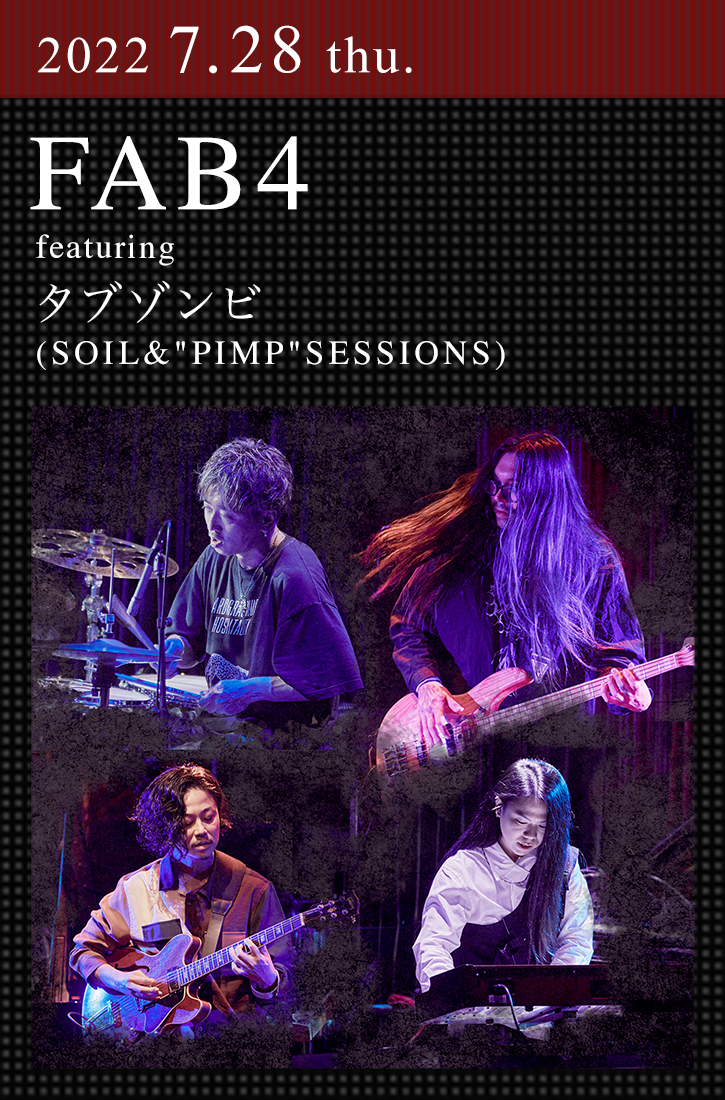 圧倒的なテクニックでオールラウンドに活躍するスーパー・プレイヤーたちが集結!FUYU、KenKen、柴田敏孝、TAKUによるユニット“FAB4”が、ゲストにSOIL&"PIMP"SESSIONSのタブゾンビを迎え一夜限りのスペシャル・ステージを披露する。FUYUは、ゴスペルの本場NYで鍛えた演奏スタイルを武器に、数々のアーティストと共演し、2016年からはEXILE ATSUSHI率いるRED DIAMOND DOGSのメンバーとして活躍中。KenKenは、LIFE IS GROOVEをはじめ複数のバンドでライヴを重ね、カリスマ的な存在感とプレイでベース界を牽引してきた。柴田敏孝は、幅広いジャンルを弾きこなすマルチ・ピアニストとして様々なアーティストから信頼を得ている。TAKUは韻シストのギタリスト/トラックメーカーとして活躍しながら数々のセッションに参加中。この4人にタブゾンビが加わり、どんな極上グルーヴを見せてくれるのか、期待が高まる。