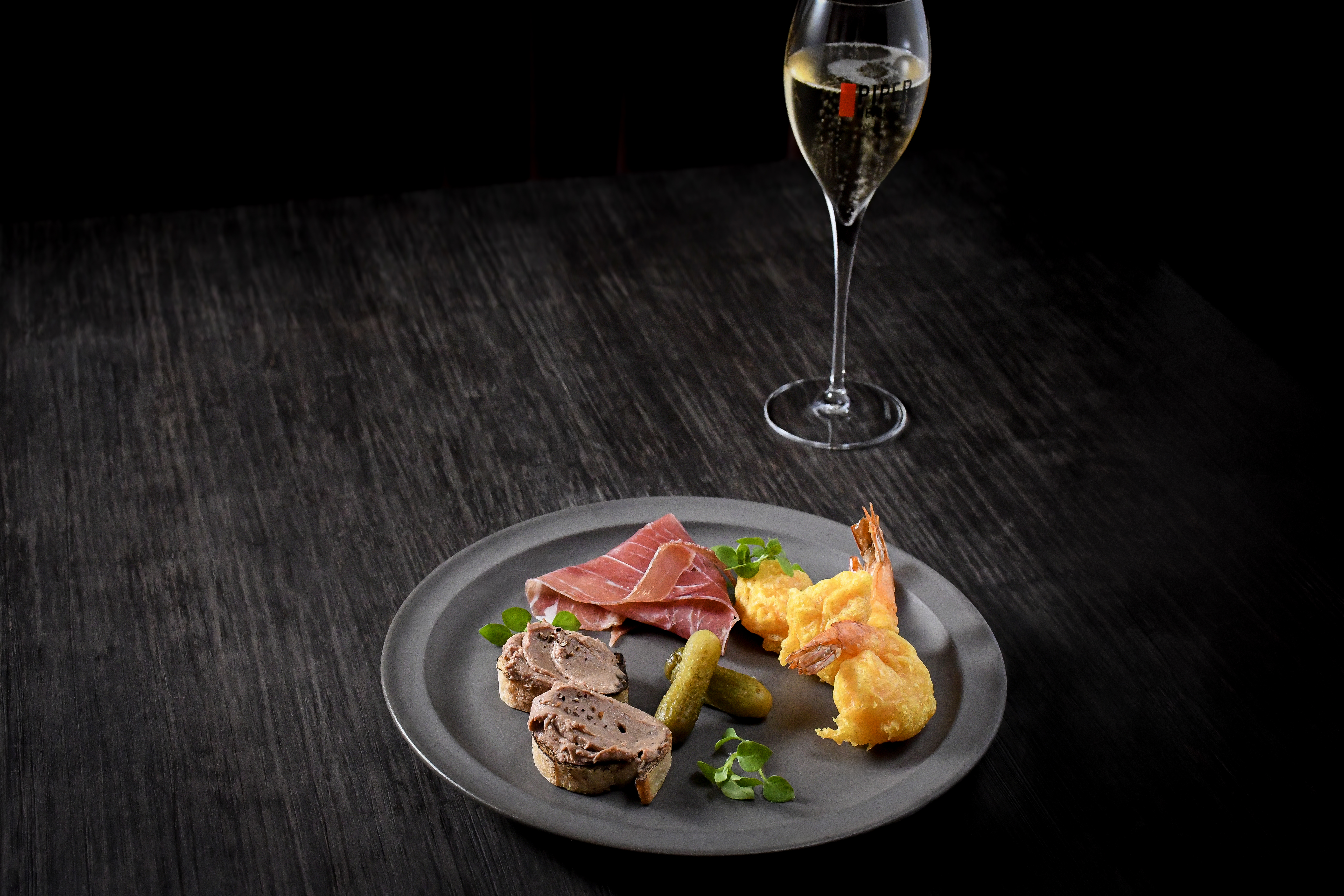 パイパー・エドシックのシャンパーニュと、シェフ厳選のおつまみ3種をセットに。
