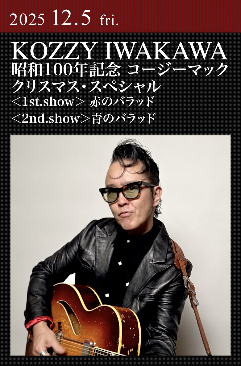 屈指のメロディ・メーカー、KOZZY IWAKAWAこと岩川浩二が、一足早いクリスマスライブを開催する。昭和63年のデビュー以来、“ROLLIE”“ザ・コルツ”“ザ・マックショウ”からソロワークまで、ロックンロールの世界を縦横無尽に渡り歩き、昭和99年に『赤のバラッド』、本年・昭和100年には『青のバラッド』と、独唱アコースティック・バラッド集をKOZZY MACK from THE MACKSHOW名義で発表。コロナ前まで毎年「クリスマスディナーショー」と題して開催していたイベントを、今回は特別に復活。Yama-chang & JOHNNY、ブギウギ・ケンタロー、UC、TOMOKI、AKIRAといった仲間たちに加え、スペシャル・ゲストとしてバイクボーイ from ザ・マックショウを迎え、“コージー・ワールド”の魅力をたっぷり届ける。