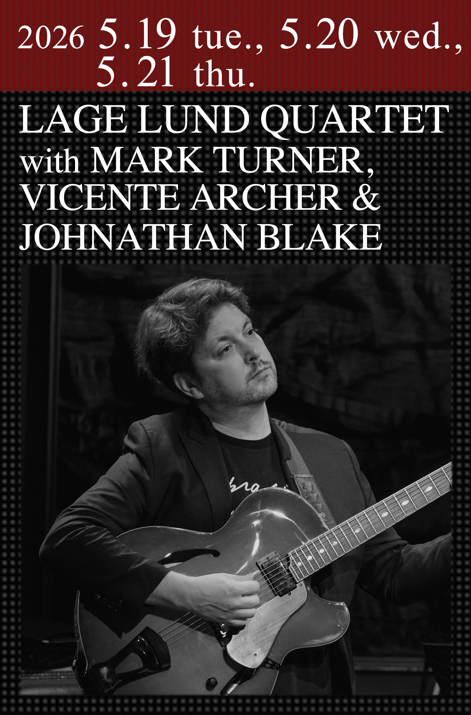 パット・メセニーやカート・ローゼンウィンケルが称賛。現代ジャズ・ギター界で圧倒的な存在感を放つ鬼才、ラーゲ・ルンドが遂に自身のユニットで登場する。ノルウェー出身の彼は、バークリー音楽大学の奨学金を得てボストンへ移住。その後ニューヨークへ拠点を移し、ジュリアード音楽院にエレクトリック・ギタリストとして初めて合格を果たした。マリア・シュナイダー、カート・エリング、シェイマス・ブレイク、アリ・ホーニグらと共演、OWL trioなど数々のプロジェクトでも活躍するルンドが、マーク・ターナー、ヴィセンテ・アーチャー、ジョナサン・ブレイクとのカルテットで表現する濃密な現代ジャズの世界を体感したい。