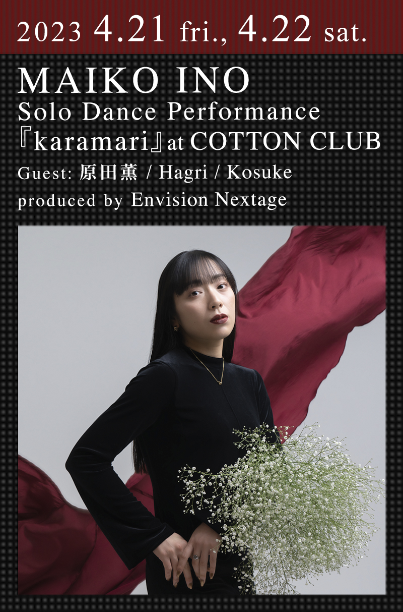 舞台・モデル・芝居と表現の媒体問わず多岐に渡り活躍。King Gnu、TK From 凛として時雨等、様々なアーティストのMVや舞台でも知られるダンサー・振付師いのまいこが、自身初となる単独公演をコットンクラブで開催する。ゲストには日本を代表するジャズダンサー・女優・振付家の原田薫、独特なセンスと多様な表現力の持ち主でチーム"KEMURI"にも所属するHagri、米津玄師、星野源、Superfly等、様々なアーティストのMVやLIVE、ブランドのコラボレーションイベント等でも活躍するKosukeが参加。根強いバレエスキルと繊細かつダイナミックな表現に定評のあるいのまいこと豪華ダンサーが繰り広げる、唯一無二のダンス・エンターテインメント・ショーを見逃すわけにはいかない。