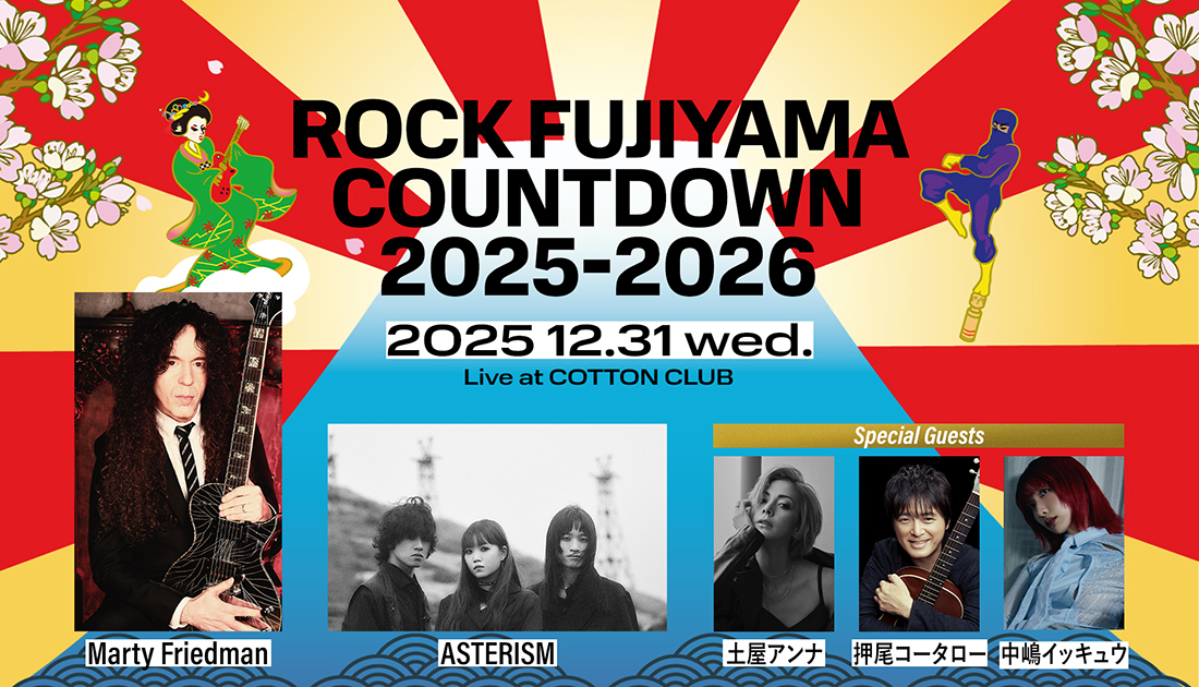 COTTON CLUBの2025-2026 カウントダウンは日本と世界の懸け橋となる最高峰ギタリスト、マーティ・フリードマン、グローバルに活動する若き超絶テクニカル・インストゥメンタル・バンドで「⼤衆(mass)に届き、響き、愛されるメタル」という意味を持つ新ジャンル<マスメタル>を掲げるASTERISMを中心に贈る豪華プログラム。題して「ROCK FUJIYAMA COUNTDOWN 2025-2026」。また、2002年にロックバンド“Spin Aqua”のヴォーカリストとして音楽活動を始め、俳優・モデル・作家など幅広い分野で活躍する土屋アンナをはじめ、一夜限りの宴を飾るスペシャルゲストが登場!“静“と“動”が同居する、来るべき新年への幕開けを華やかに!