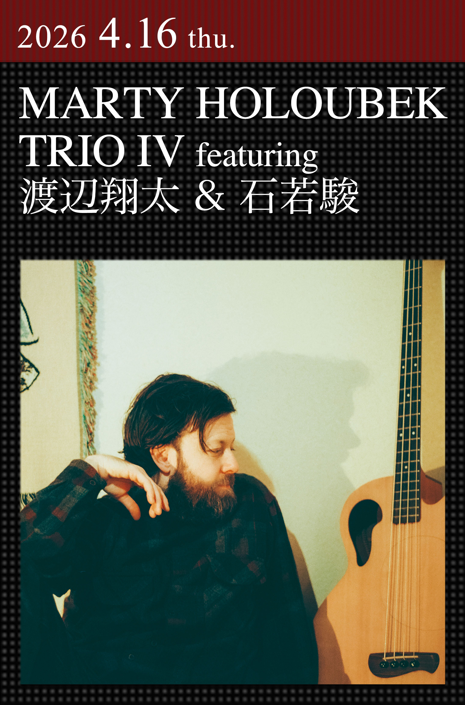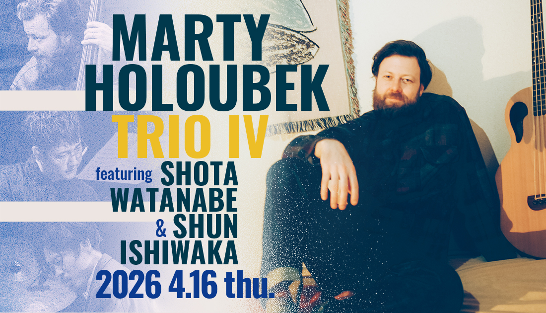 日本音楽界の重要なポジションを担う鬼才ベーシスト、マーティ・ホロベックが約1年ぶりに登場。今回の公演は、初来日時に意気投合したドラマーの石若駿、多方面からのアーティストのサポートや楽曲制作、アレンジ等で精力的に活動するピアニストの渡辺翔太との“Trio IV”で開催される。オーストラリア・アデレード出身のマーティは、メルボルンで多くの国外アーティストとのコラボレーションを重ねた後に拠点を東京に移し、現在は自身のTrioシリーズをはじめ、SMTKの共同リーダー等として活躍。昨年12月に『Trio IV: The Mountains, They Listen』を発表し、来る3月には続編のリリースも予定されている。ジャズの枠組みを超えた、新鮮で刺激的な音楽体験に浸りたい。