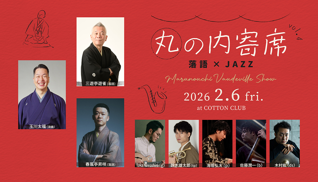 落語×JAZZ@コットンクラブ!演芸界の表現者とジャズ・ミュージシャンによる大好評のコラボレーション・ライヴ「丸の内寄席」が、2年ぶりに開催される。今回は、落語家の三遊亭遊雀(平成19年度国立演芸場主催「花形演芸大賞」大賞受賞)、浪曲師の玉川太福(令和3年度国立演芸場主催「花形演芸大賞」銀賞受賞)、落語家の春風亭昇咲(令和2年に二ツ目昇進)が出演。ジャズ・サイドには、Taka Nawashiro (g)、鈴木雄太郎 (tp)、海堀弘太 (p)、佐藤潤一 (b)、木村紘 (ds)が参加する。長く豊かな歴史を持つ演芸とジャズが出会う、新たなエンターテインメントの形を提示する一夜。ジャンルの垣根を越え、それぞれの分野の熱心なファンはもちろん、初めての人でも気軽に楽しめるスペシャル・ショウとなる。