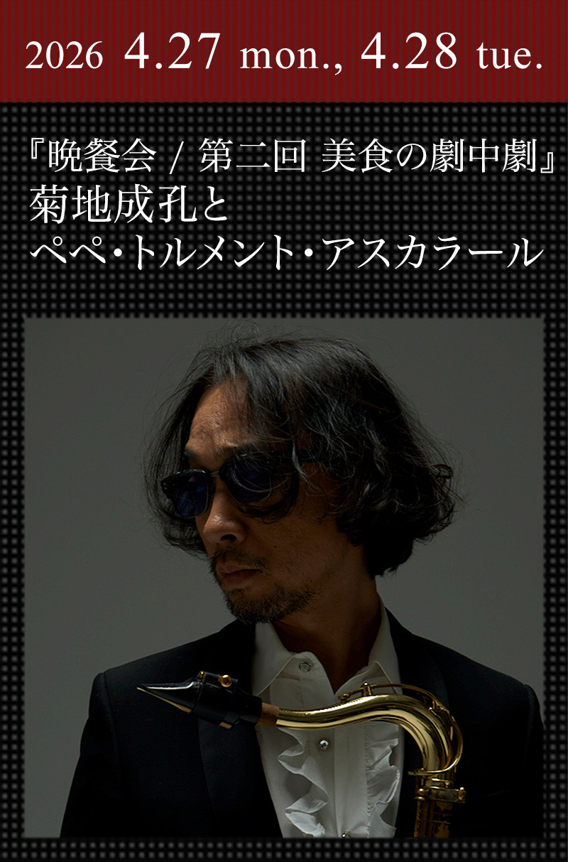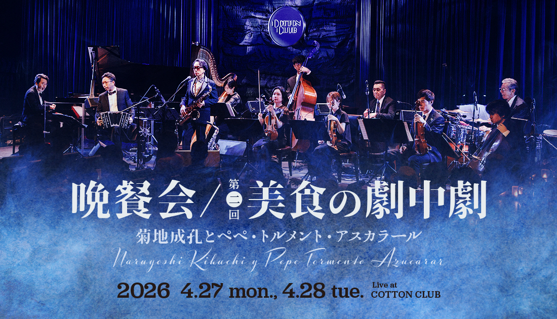 菊地成孔がプロデュースを手掛ける至高のディナー・ショウが再びコットンクラブで開催される。題して『晩餐会 / 第二回 美食の劇中劇』。将来はグランド・キャバレーの運営を行いたいとかねてより語る菊地が、“世界でも類例のない超混血系オルケスタ”ペペ・トルメント・アスカラールを率いて登場、さらに音楽家の枠を超えて料理、ドリンク、ドレスコードもトータルにプロデュース。結成20周年記念アルバム『天使乃恥部』も話題を集める楽団ペペ・トルメント・アスカラールの官能的で情熱的なサウンドと、料理、ワインのペアリングができるスペシャルなディナー・ショウ。日常を遠く離れたひとときを堪能したい。