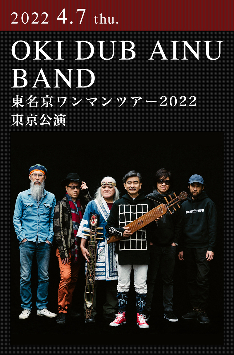 アイヌの伝統を今の時代に継承する、トンコリ奏者でプロデューサーのOKIが率いるアイヌ・ルーツ・バンド"OKI DUB AINU BAND"が、名古屋・京都・東京の三都市を巡るワンマンツアーを開催!コットンクラブで盛大にツアーを締めくくる。カラフト・アイヌの伝統弦楽器トンコリを大胆にも電化し、ベースとドラムで強靭に補強したヘヴィなサウンドに、アイヌの伝統歌(ウポポ)や踊り(リムセ)、アフログルーヴ、レゲエ、ロック等が入り混じったダブサウンドで海外フェスを中心にライヴを展開し、2016年にセルフタイトル・アルバムを機に日本上陸。これまで世界的規模のワールドミュージックの祭典”WOMAD”への出演をはじめ、アジア、アメリカ、ヨーロッパなど世界各地をツアーし、国内でもFUJI ROCK FESTIVAL、橋の下世界音楽祭など数多くのフェスやイベントに出演している。革新的な音楽でワールドワイドに活動を続ける、唯一無二のバンドの最新ステージに期待が高まる。