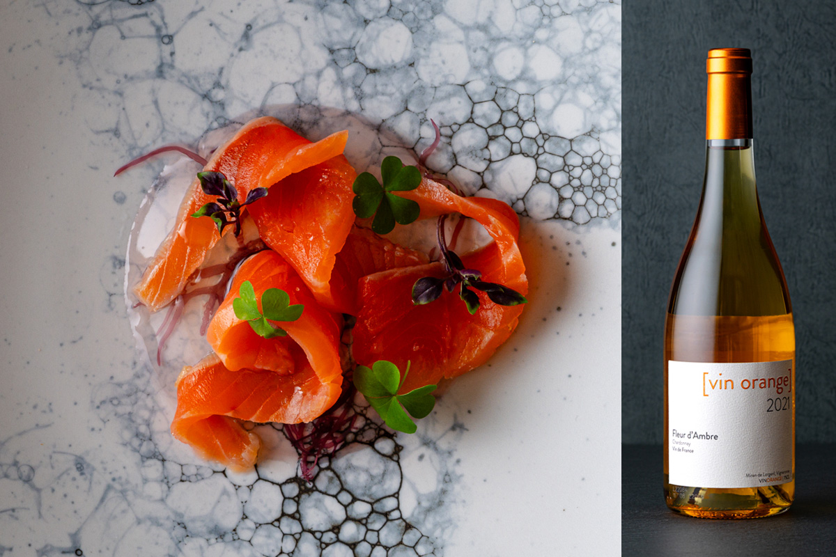 鮮やかな鱒と湧水のイメージにぴったりな透き通った色調の爽やかなオレンジワイン。 穏やかな苦味と渋みが良いアクセント。