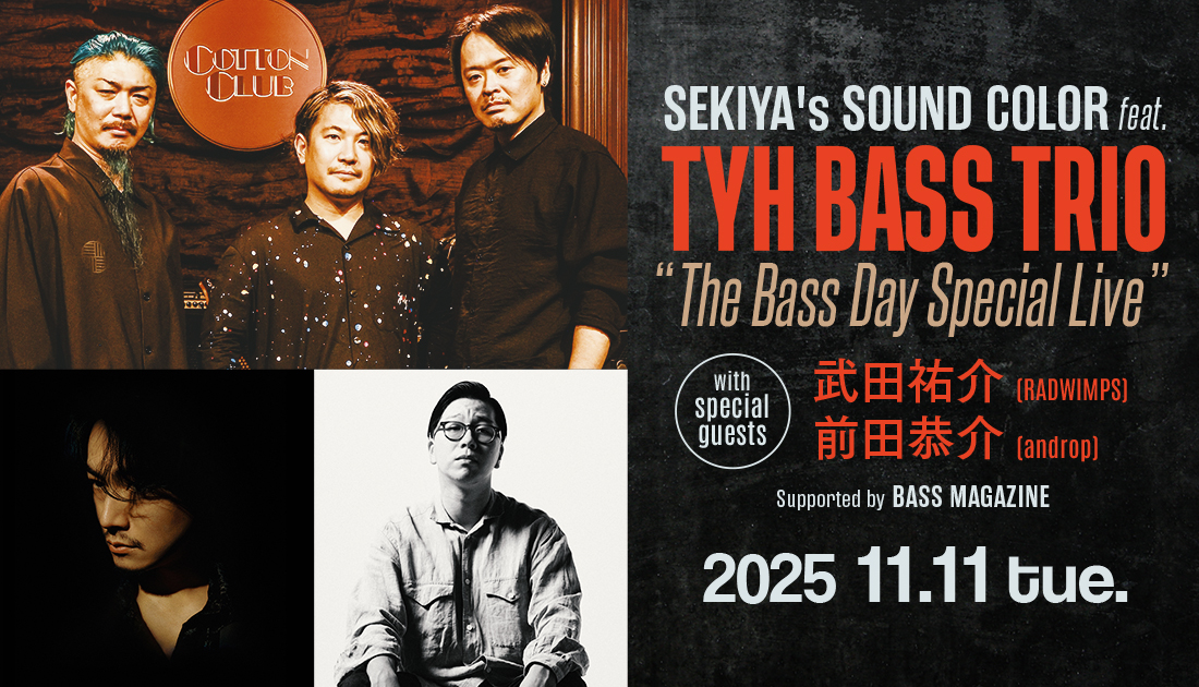 昨年の“11月11日=ベースの日”にコットンクラブ初登場。関谷友貴(TRI4TH / Kurofune)、永田雄樹(JABBERLOOP / POLYPLUS)、HIDEYAN(Calmera)による日本でも数少ないエレキベースだけのセッションバンド、TYH BASS TRIOが今年も11月11日にライヴを開催する。スペシャル・ゲストは、RADWIMPSのベーシスト武田祐介 と、andropのベーシスト前田恭介。5人のベーシストに加え、竹内大輔(p)、きたいくにと(ds)という名手が集結し、ベースに最大限のリスペクトを込めた一夜限りのセッションを繰り広げる。他に類を見ない異色の編成で、いったいどのような楽曲がプレイされるのか?ベースの魅力、ベースの醍醐味を全身で体感する一夜となりそうだ。