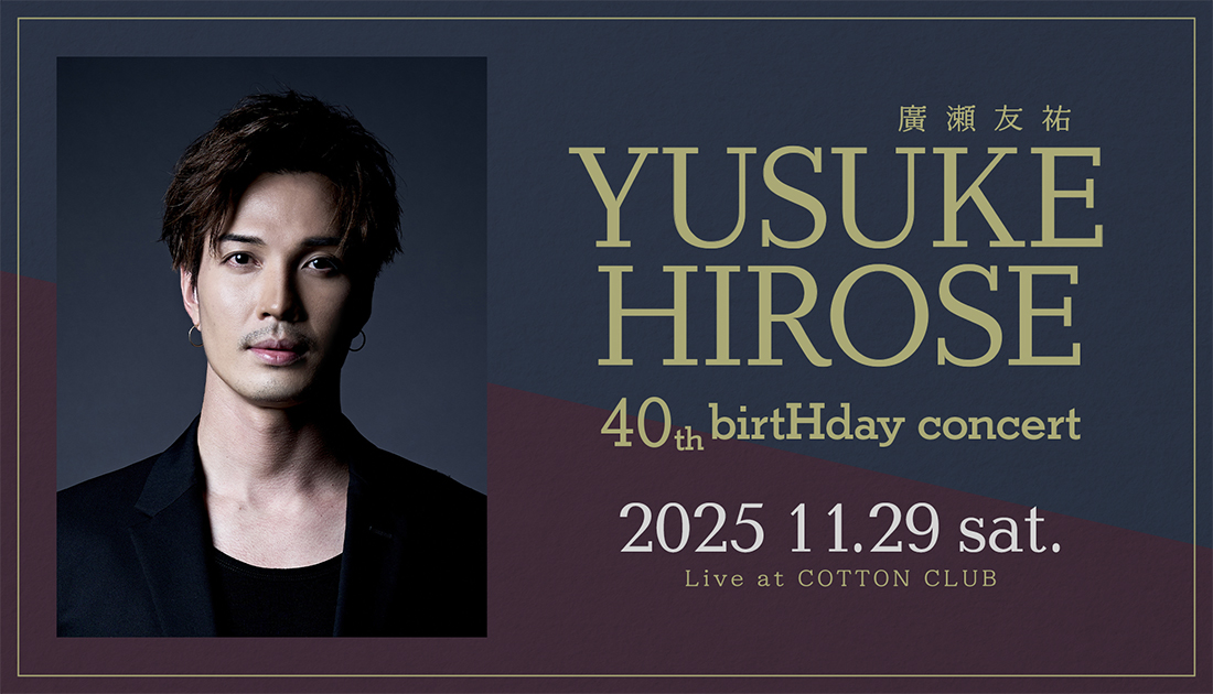 ミュージカル「マタ・ハリ」「天使にラブ・ソングを~シスター・アクト~」「スリル・ミー」などに出演し、2022年に上演した「モダン・ミリー」のトレヴァー・グレイドン役で「第30回読売演劇大賞優秀男優賞」を受賞。俳優・歌手として幅広い活躍を続ける廣瀬友祐がコットンクラブに登場、満40歳記念となるスペシャル・バースデーライヴを開催する。公演ではオリジナルソングに加え、過去に出演したミュージカルからの楽曲、そしてルーツとなったカバー曲などを網羅し、さらに1st.show と 2nd.show で一部の選曲や衣装を変更して多彩なパフォーマンスをお届けする予定。2025 年、Musical Awards TOKYO 助演俳優賞 グランプリに輝いた廣瀬友祐の魅力のすべてをライヴで満喫したい。